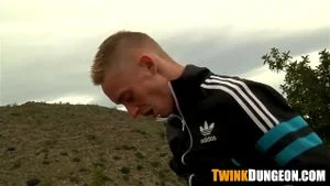 Cute blond slave got tied up outdoors and spanked by his master. He than ass fucked him roughly and when he finished with him he pisses on him!