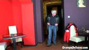 Cute bartender fucks oldie in public restaurant