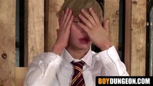 Blond twink in his school uniform gets the spanking of a lifetime performed by his mature master.