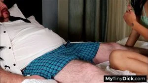 She mocks him, palming his pitiful small dick