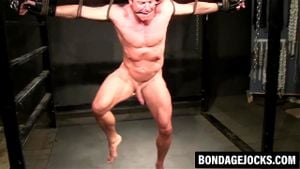 With a cord around his long uncut cock, the other end tied to his raised foot, every single move he makes delivers agony.