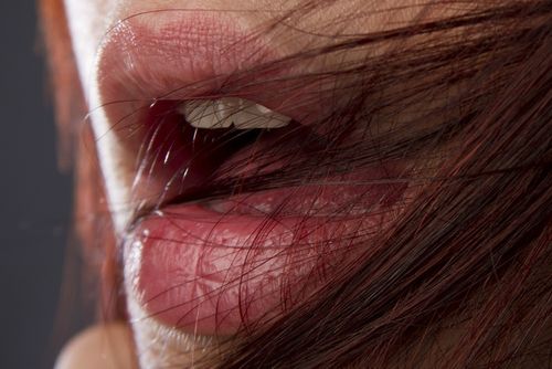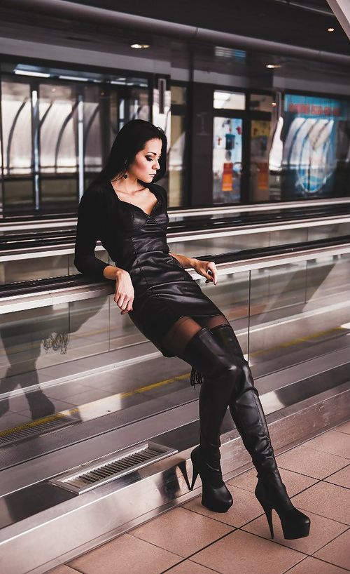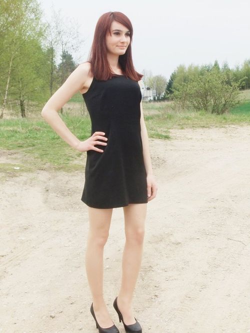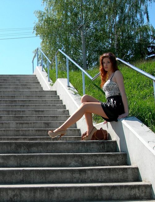 Sexy redhead chick posing outdoors in tigh leather mini dress, fishnets and boots