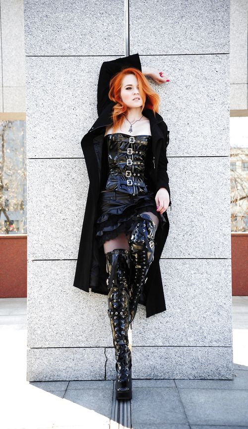 Foxy beauty posing outdoors in tight leather mini dress and boots