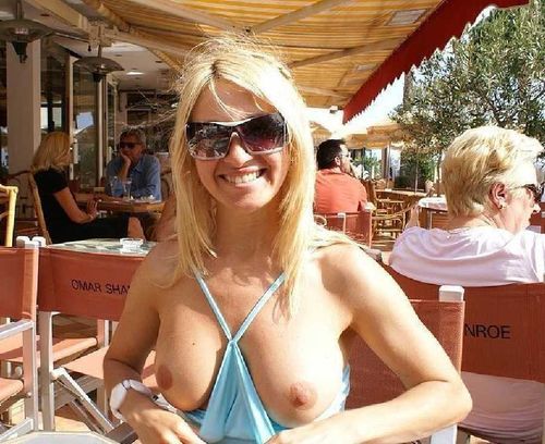 Beautiful blonde wife in sexy dress flashing her breast in restaurant