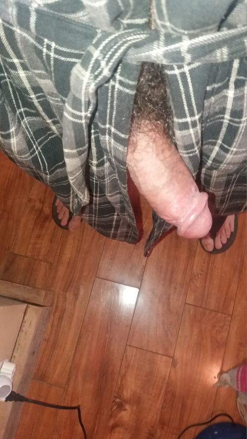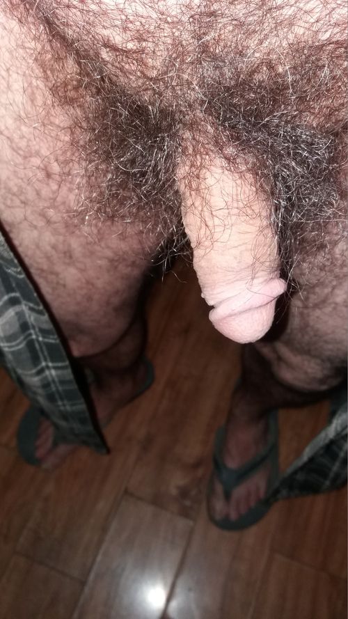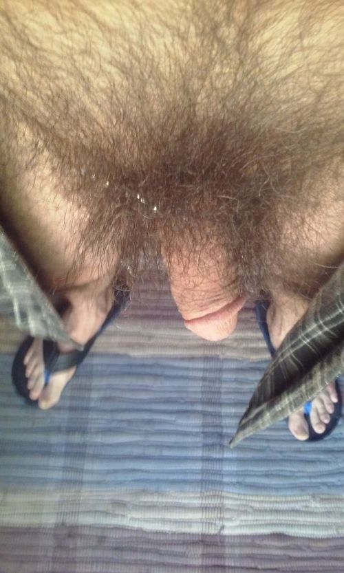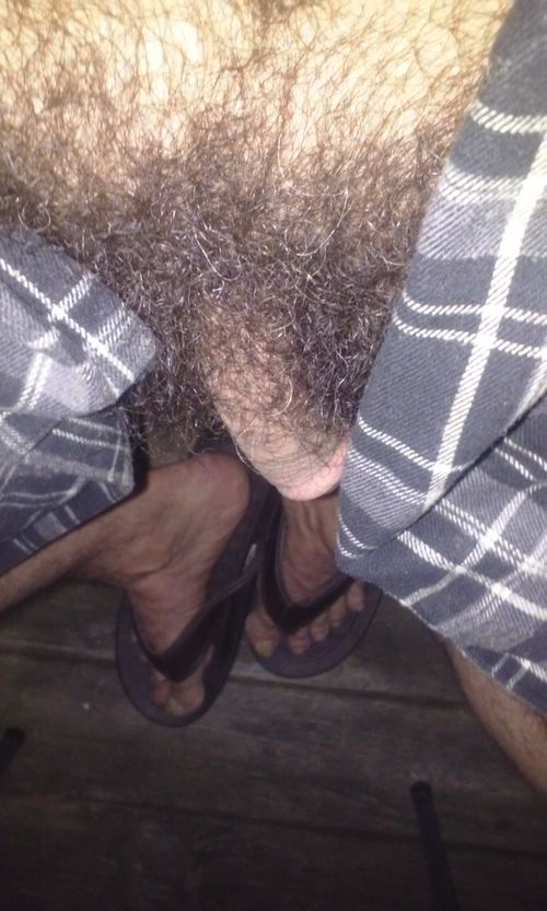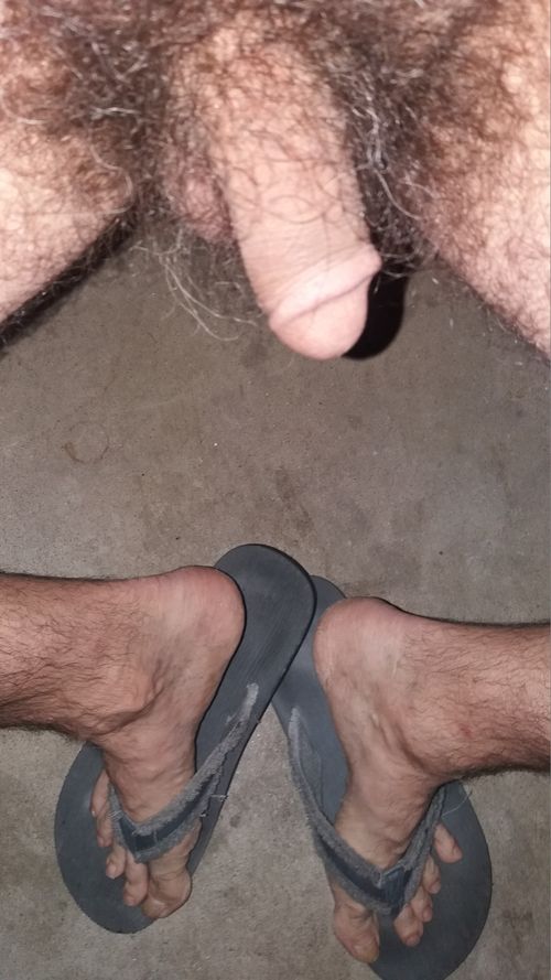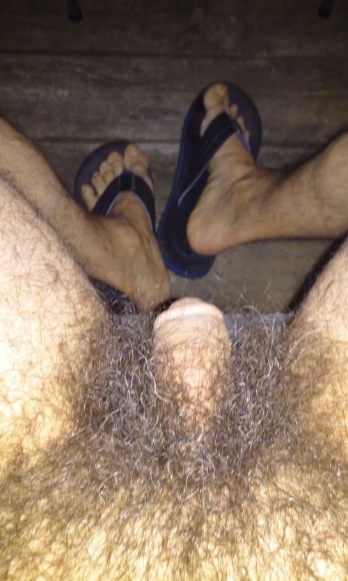 Outdoors, completely naked, except for flip flops and a cock ring, stroking my big hard cock